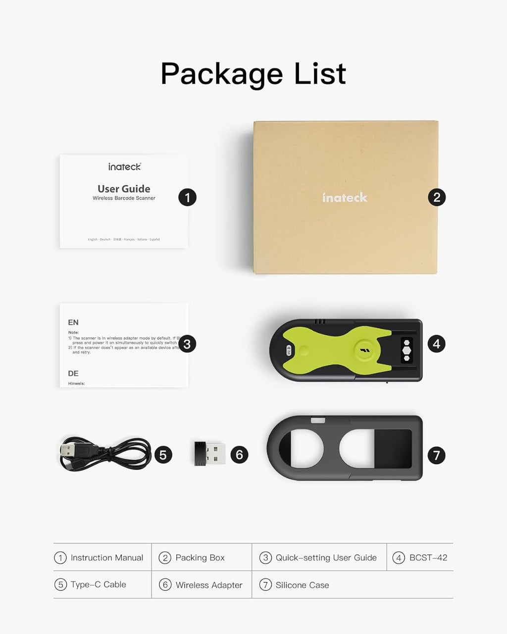 Denne Bluetooth 2D Stregkodescanner med 2,4 GHz USB-adapter er en avanceret trådløs stregkodelæser, som hurtigt og pålideligt læser både 1D- og 2D-stregkoder direkte fra papir eller skærme. Med tre tilslutningsmetoder, eksklusive hurtigknapper og lang batterilevetid er den perfekt til lagre, POS-systemer, kontorer og mobil brug.