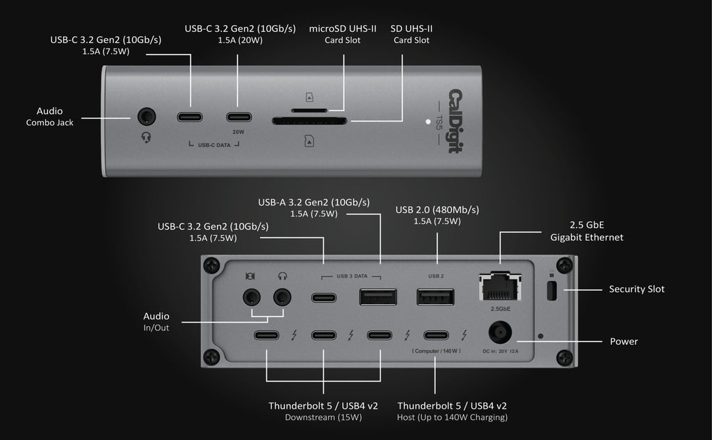 CalDigit TS5 er en kraftfuld Thunderbolt 5-dockingstation med 15 porte og op til 140W opladning. Den er designet til professionelle brugere, der ønsker at udvide tilslutningsmulighederne og arbejdsgangen på Mac eller PC. TS5 tilbyder understøttelse af flere eksterne skærme, høj datahastighed og stabil strømforsyning til laptops, tablets og USB-enheder. Perfekt til kreative arbejdsflows, gaming og multitasking.
