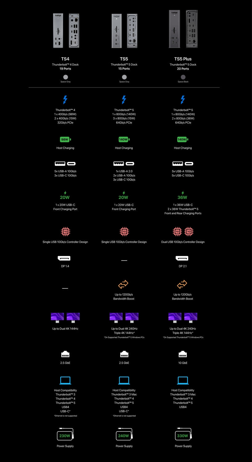 Thunderbolt 5: 1× værtport (120Gb/s), 3× downstream-porte (80Gb/s)