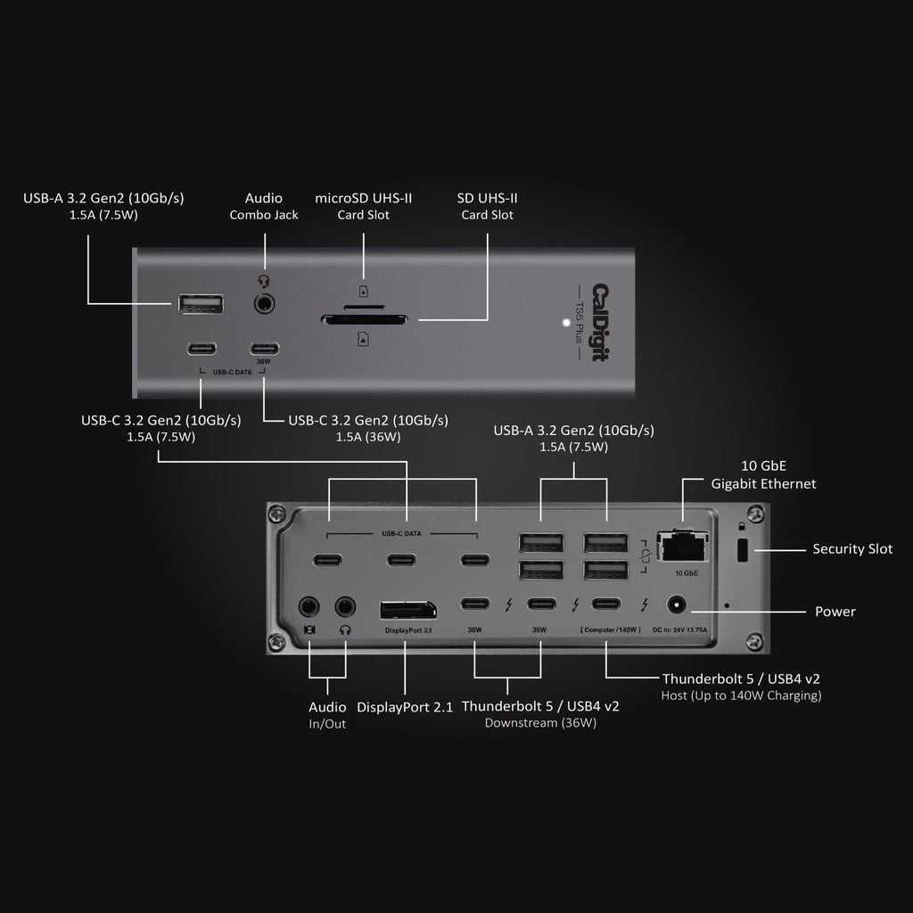 CalDigit TS5 Plus er den mest avancerede Thunderbolt 5-dockingstation på markedet og leverer hele 20 porte for maksimal tilslutningsmulighed. Med understøttelse af op til 120Gb/s båndbredde, tre eksterne skærme på Windows, 10GbE-netværk og 140W strømforsyning er TS5 Plus designet til professionelle brugere, der kræver hastighed, stabilitet og fleksibilitet. Den understøtter højopløselige skærme op til 4K 144Hz eller 5K/6K på kompatible Thunderbolt- og DisplayPort-forbindelser, hvilket gør TS5 Plus ideel til kreative arbejdsflows, gaming og professionel grafik.