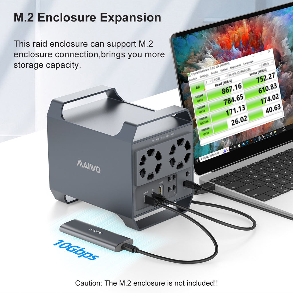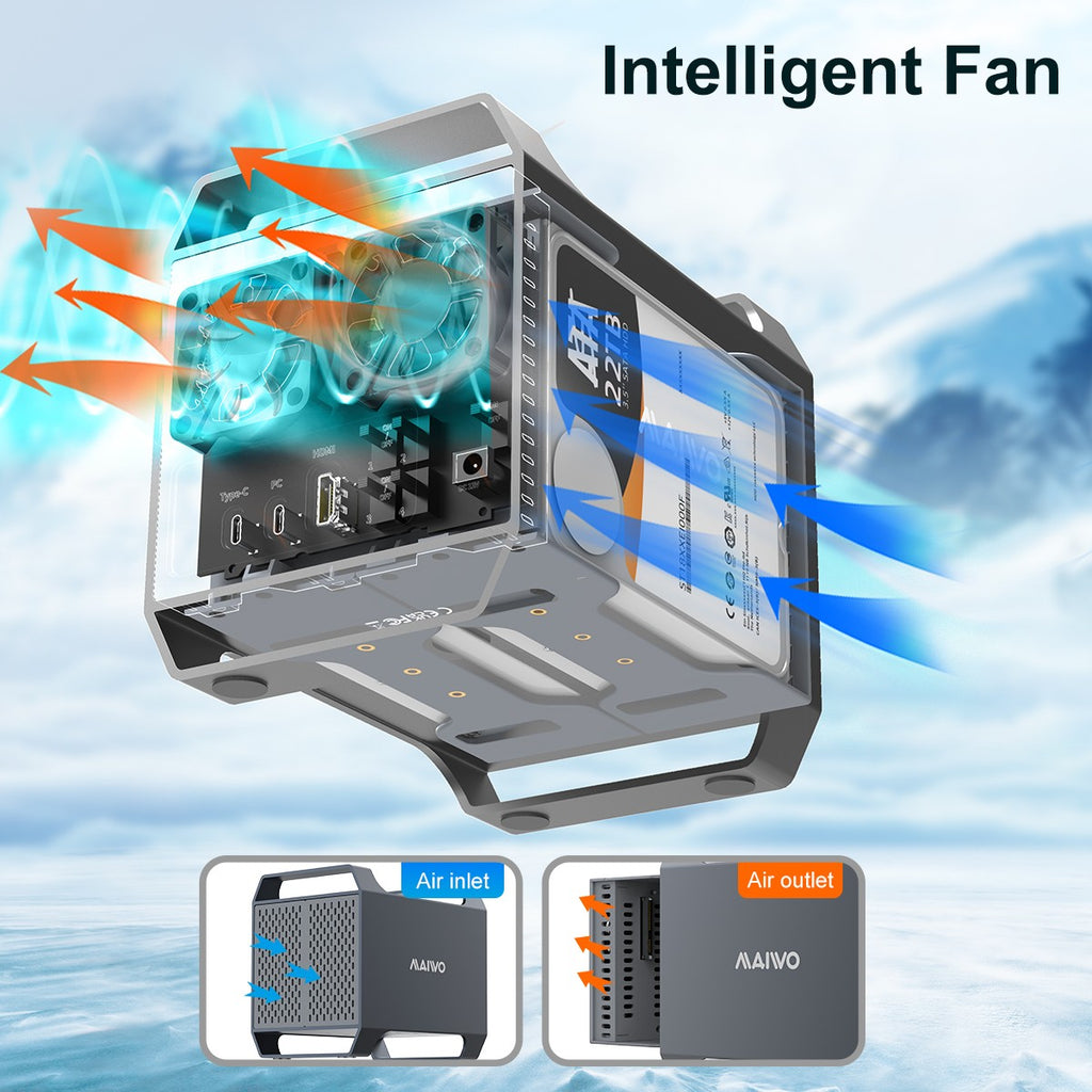 The MAIWO 4 Bay Hard Drive Enclosure features an aluminum alloy design and is equipped with 2 cooling fans for optimal heat dissipation. These fans automatically activate when your hard drive temperature exceeds 48℃, ensuring your 3.5” SATA HDDs are protected while maintaining energy efficiency. This makes our 4 bay DAS enclosure not only intelligent but also environmentally friendly. Designed to handle large amounts of data, this 4 bay hard drive enclosure supports daisy chaining with other storage devices for extensive storage expansion. Easily create cost-effective storage solutions with our 4 bay DAS that allows you to connect multiple 3.5” SATA HDDs, making it a versatile option for all your data needs. Our 4 bay HDD enclosure is compatible with 3.5 inch SATA SSDs and HDDs, supporting a single disk expansion of up to 24TB, totaling an impressive 96TB capacity. Whether you're using MAC OS, Windows, or Linux, this SATA enclosure 4 bay with cooling fan meets diverse system requirements, ensuring compatibility with various devices including smart TVs, computers, and laptops. The MAIWO 4 Bay DAS comes with an HD-TV port, allowing you to easily connect your computer to your TV and support 4K HD video output. This feature enhances your multimedia experience, making our 4 bay DAS USB C enclosure perfect for both work and entertainment needs. Equipped with an 84W external power supply, this 4 bay no RAID enclosure ensures sufficient power for larger capacity hard drives, promoting stability and safety during data storage and transfers. Additionally, the independent power switch provides complete control over your hard drives, making this type C HDD bay enclosure a practical choice for users seeking reliability and convenience.