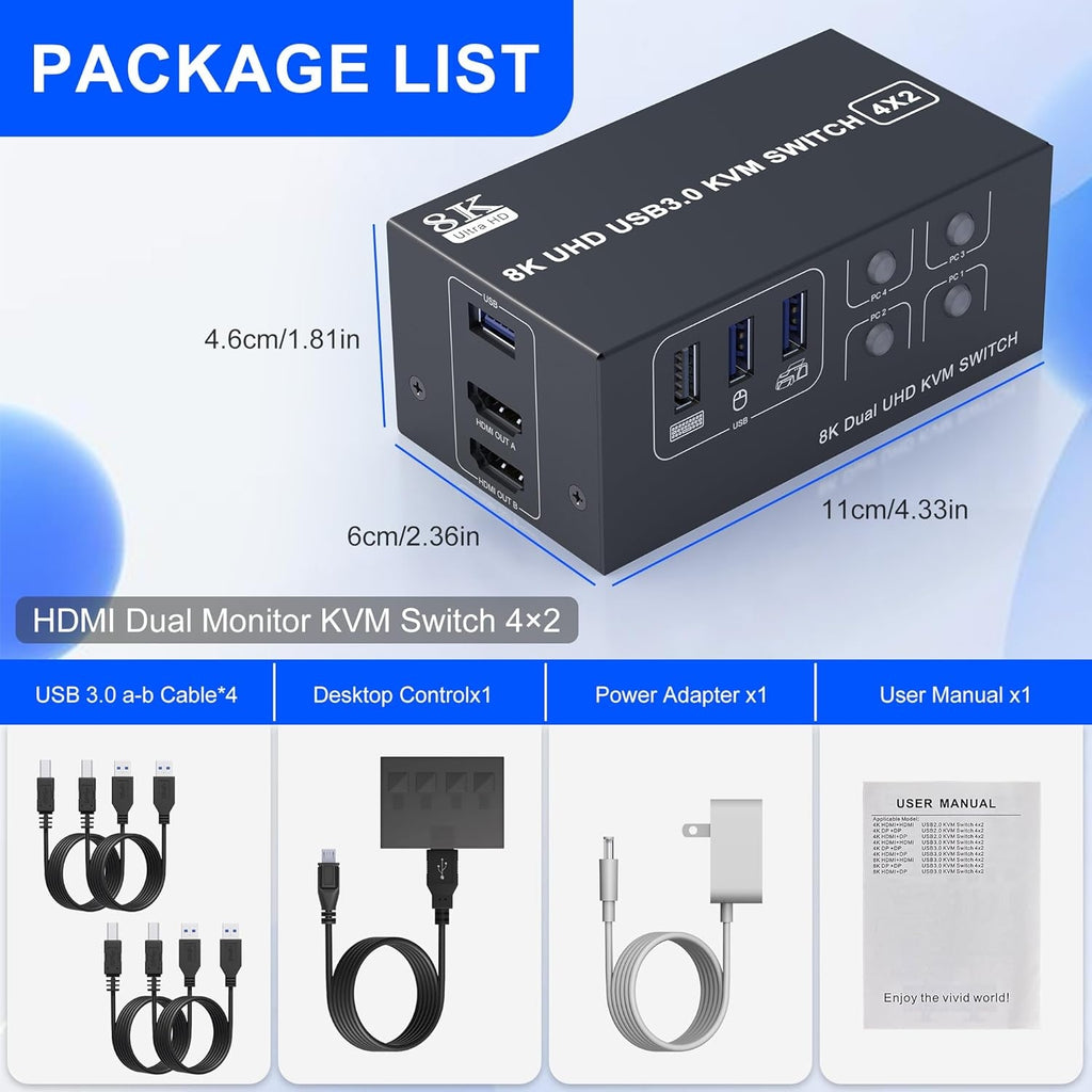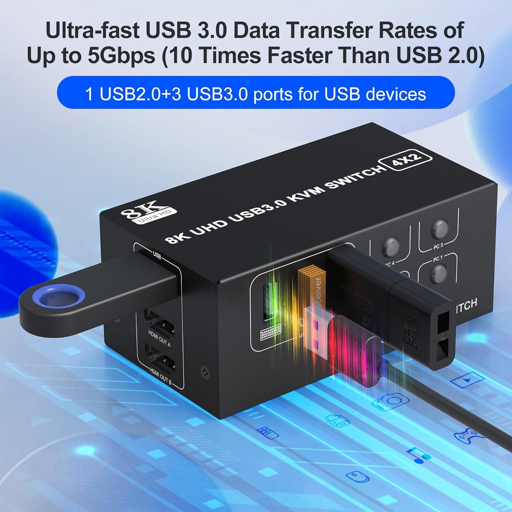 NÖRDIC KVM-Switch 4 til 2 HDMI 2.1 8K@60Hz 4K@120Hz 4xUSB-A