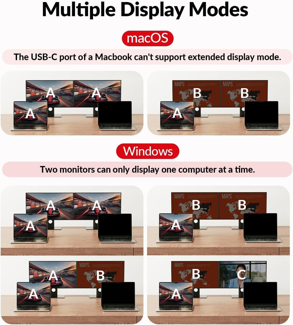 USB-C KVM Dockningsstation til 2 bærbare computere, Dual 4K-skærm, 11-i-1 med 100W PD, 1Gbps LAN & EDID-emulering